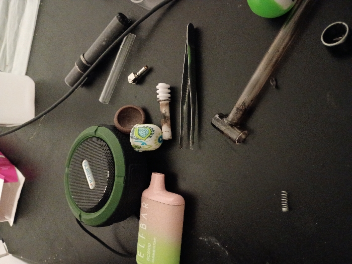 variety of objects scattered on a dark grey surface, likely a table, in a residential setting. The objects include a green portable speaker, a pink and green disposable vape pen, a metal spring, a pair of tweezers, a small brown ceramic bowl, a glass tube, and a small metal object with a black ring. The location is an apartment or home in Seattle, Washington, United States, based on the provided coordinates. The scene appears to be a still life, with no people or animals present.