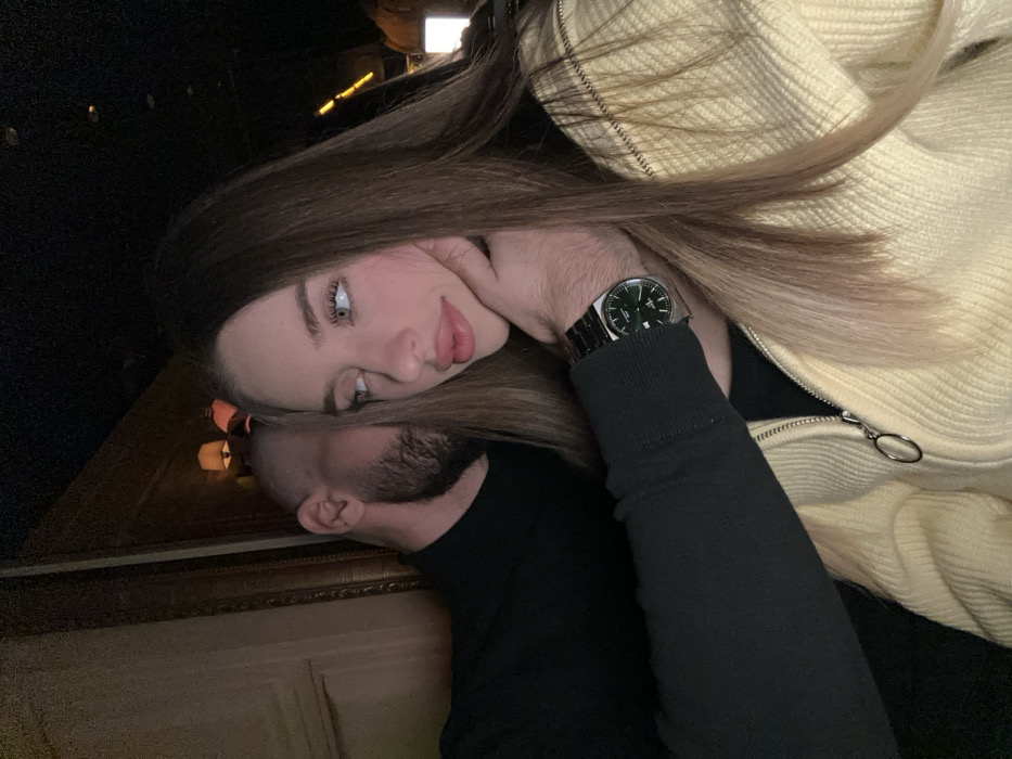 An indoor scene featuring two individuals, described as occurring in Sofia, Bulgaria, under dim lighting. A female subject occupies the right foreground, her head turned left in profile. She has long, brown hair, light eyes, and full lips, wearing a light yellow ribbed zip-up cardigan with a circular zipper pull over a black top. Her left jawline is held by the right hand of a male subject, whose arm originates from the left side of the frame. The male subject, partially visible behind her, has a shaved head or very short hair, a dark beard, and wears a black long-sleeved shirt. A silver-toned wristwatch with a dark green dial is visible on his right wrist. The background features a dark, ornate framed element on the left and indistinct warm lighting further back. The physical interaction indicates close proximity between the two individuals.