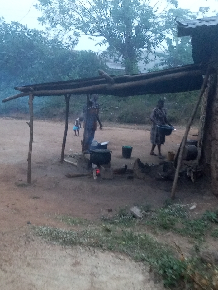 The image captures an outdoor domestic scene in Aramoko-Ekiti, Nigeria, under diffused lighting, likely twilight