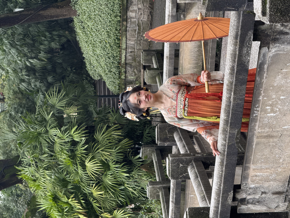 - "The image displays a female individual in traditional Chinese attire within an outdoor garden or park setting in Yuzhong District, China" by FM-yNGMq2, licensed under CC BY 4.0