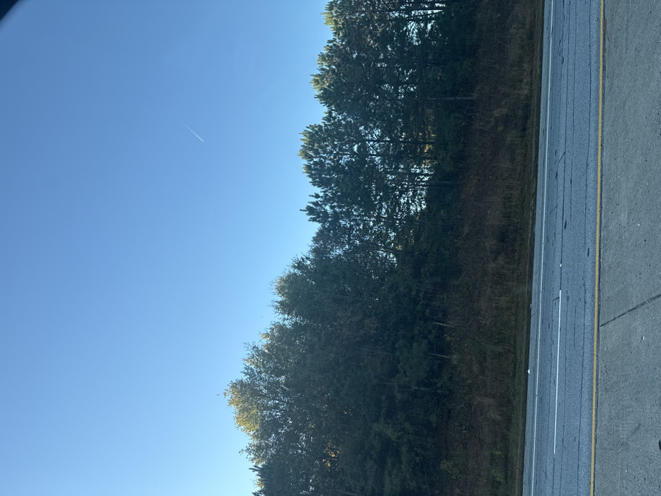 The scene depicts a static outdoor environment in Lawrenceville, United States. The foreground comprises a multi-lane asphalt road with a light gray concrete shoulder or median. The road surface exhibits white dashed and solid lines, along with a continuous yellow line separating the road from the shoulder. Immediately adjacent to the road, a dirt embankment rises, densely covered with a mix of deciduous trees, some displaying autumnal browning or sparse foliage, and numerous dark green coniferous trees. The background features a clear, bright blue sky containing a single, faint white aircraft contrail in the upper right quadrant. No individuals, animals, or active events are present in the image.
