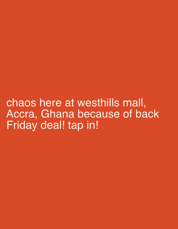 The image displays a solid orange rectangular field. White, sans-serif text is superimposed in the lower-left quadrant, stating: "chaos here at westhills mall, Accra, Ghana because of back Friday deal! tap in!". This text describes a scene of disorder and high activity at Westhills Mall, located in the Mile 11 area of Accra, Ghana. The implied environment is a crowded retail space, with an unspecified number of individuals participating in or reacting to a "Black Friday deal," leading to the described "chaos." No specific people, subjects, or objects from the mall scene are visually present within the orange background. The phrase "tap in!" acts as an invitation or call to action.