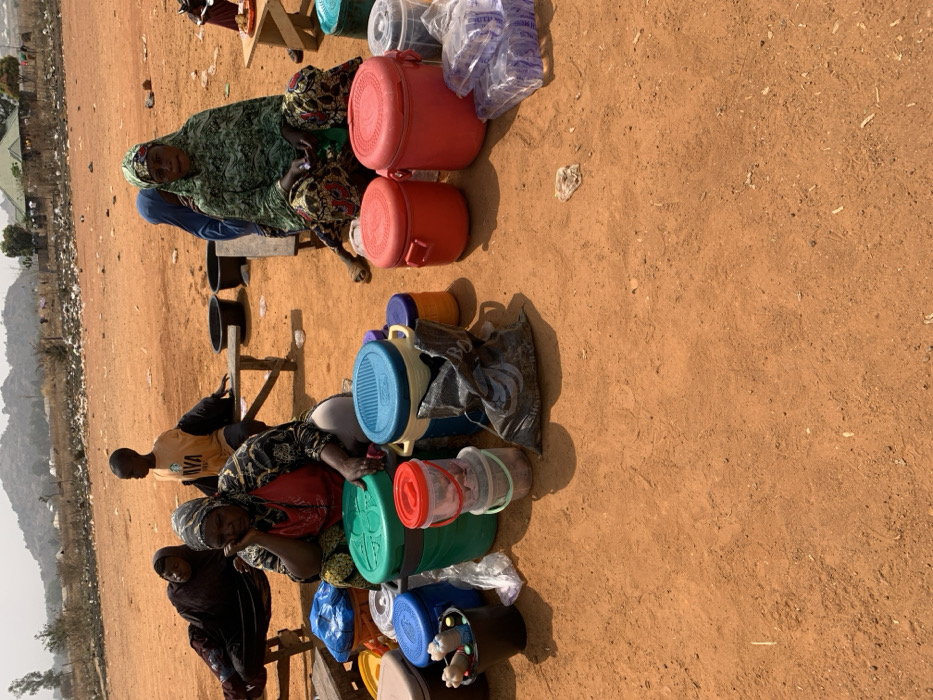 The image depicts an outdoor scene in what appears to be an informal gathering or market area in Gwafan, Nigeria. The ground is dry, reddish-brown earth. The scene is illuminated by bright sunlight, casting distinct shadows. In the foreground, a woman wearing a patterned headscarf and a red top kneels on the ground, resting her chin on her left hand. Around her are various containers: a green lidded bucket, stacked clear plastic buckets, a black bucket containing bottles, a blue lidded cooler, and other smaller containers. A black sack lies beside these items. To her immediate left, another individual, covered in dark fabric, lies on a wooden bench. Behind the kneeling woman, a young person wearing a light-colored "JAVA" t-shirt stands, looking right. Further back, two dark plastic basins are on the ground. To the right, another woman, wearing a green patterned headscarf and skirt, sits directly on the ground, looking towards the viewer. Beside her are two large red cylindrical containers and stacks of clear plastic packages containing white items. A small wooden table with an orange bowl of food is visible behind her. Another individual, partially visible, is seated further back on a wooden bench, wearing a blue head covering. The background features a hazy, arid landscape with distant hills or mountains. Scattered sparse vegetation and a line of accumulated refuse are visible in the mid-background, beyond which stand several small, simple structures.