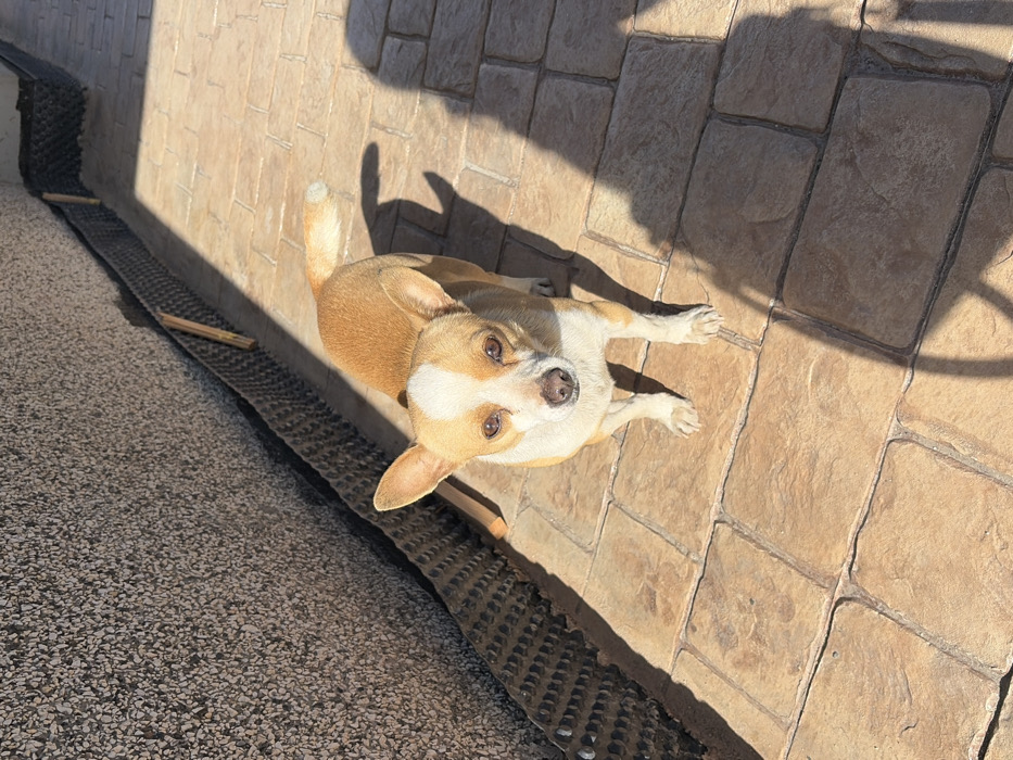 - "A small, tan and white dog is depicted standing on a paved outdoor surface in Kableshkovo, Bulgaria" by FM-eNkWy1, licensed under CC BY 4.0