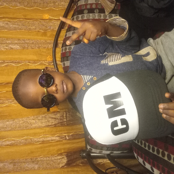 A young boy with sunglasses lounges on a patterned chair, giving a peace sign. He wears a dark blue shirt with light-colored embellishments and rests a black cap with white "CM" lettering on his leg. A textured, golden yellow curtain serves as the backdrop. The composition is casual, capturing a relaxed moment.