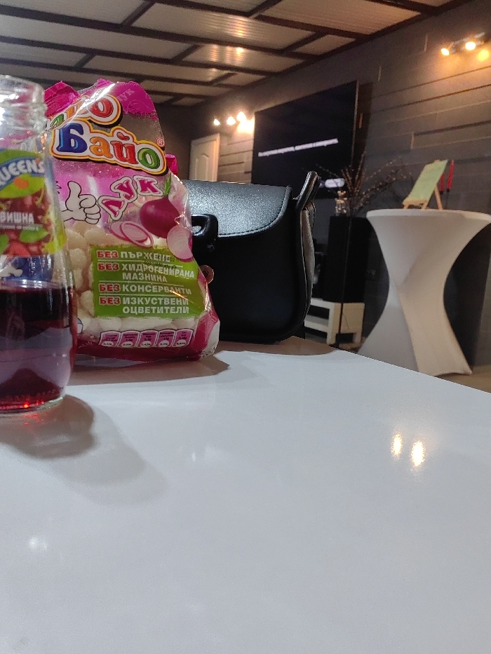 The image depicts a close-up view of items on a white, reflective table surface within a modern indoor setting in Mezdra, Bulgaria. In the immediate foreground, a clear glass bottle containing a dark red liquid is positioned on the left, its label partially visible with "QUEENS" and "ВИШНА" (Cherry) text. Adjacent to the bottle, slightly right and behind it, rests a pink and white plastic bag of snacks labeled "БайО ЛУК" (Baio Onion), featuring an image of an onion or radish. The label also indicates "БЕЗ ПЪРЖЕНЕ" (without frying), "БЕЗ ХИДРОГЕНИРАНА МАЗНИНА" (without hydrogenated fat), "БЕЗ КОНСЕРВАНТИ" (without preservatives), and "БЕЗ ИЗКУСТВЕНИ ОЦВЕТИТЕЛИ" (without artificial colors). A black leather-like shoulder bag or purse is situated behind the snack bag. The background reveals a dimly lit interior with a dark, paneled wall and a matching grid-patterned ceiling that reflects warm light from multiple fixtures. A large, dark flat-screen television is mounted on the wall, displaying white text on its dark screen. To the right of the screen, a tall, dark vase with sparse decorative branches is visible. Further right, a white, hourglass-shaped pedestal table stands, with a green easel or display stand positioned behind it. A white door is visible in the background to the left of the television. No individuals are present in the frame.
