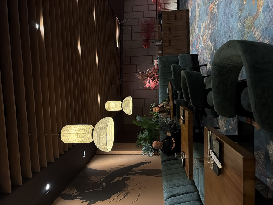 The image captures the interior dining area of Restaurant 19, located within the Sense Hotel in Sofia, Bulgaria. The scene is dimly lit, illuminated primarily by two prominent, tiered pendant lights with woven fabric shades, and supplementary recessed ceiling lights. The ceiling is constructed from horizontal wooden slats. A bald male subject, wearing a dark long-sleeved shirt, is seated on the left side of a teal upholstered booth, facing right. A female subject with dark hair is seated at a round table in a corner of the same teal booth structure, facing left, appearing to interact with the male subject. Both subjects have water glasses and small dark dishes on their dark wooden tables. On the table in the immediate foreground, a set of chopsticks rests on a dark rectangular plate. The left wall features a large, dark abstract mural against a light brown background. The back wall is composed of rectangular, textured panels. Green tropical plants are situated behind the back booth, with additional red and pink ornamental foliage visible on the right side of the back wall. The floor is covered with a patterned carpet displaying abstract blue, green, and orange motifs. A dark wooden service cabinet with bottles and glassware is positioned on the right side of the dining area.