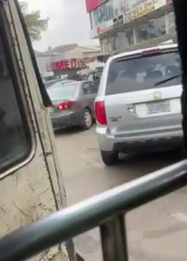 street scene viewed from inside a vehicle, possibly a van or a bus, with a focus on cars and the surrounding buildings. A silver Honda Pilot is visible in front, parked on the side of the road. Further down the street, a white Toyota pickup truck is also parked. The vehicle with the camera appears to be stationary. The background features multi-story buildings with signage, including what appears to be a furniture store and a barbershop. The weather seems to be overcast or slightly hazy. The overall impression is of a typical urban street scene, with parked cars and commercial buildings. The road surface is paved and shows signs of wear.