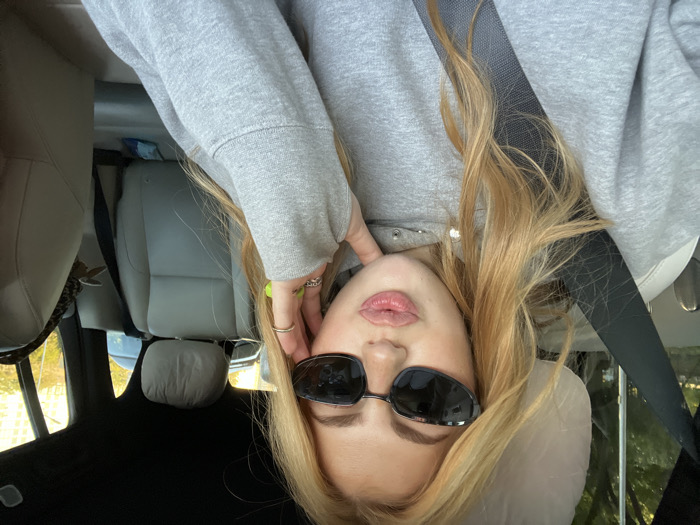 A female individual with light-colored hair, wearing dark oval sunglasses and a grey hooded sweatshirt, is seated in the front passenger seat of a vehicle