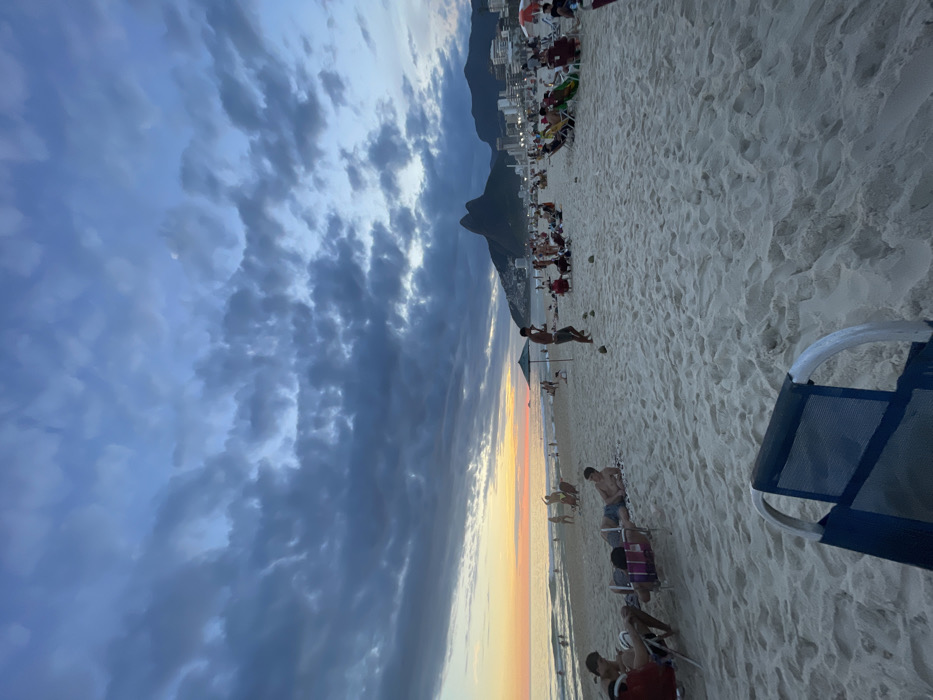 A beach scene unfolds under a cloudy sky. People are relaxing on the beach with buildings and mountains in the background. A chair sits in the foreground, with people relaxing on chairs in the mid-ground, and people walking along the water's edge. The sky is a mixture of dark grey clouds and hues of sunset colors.