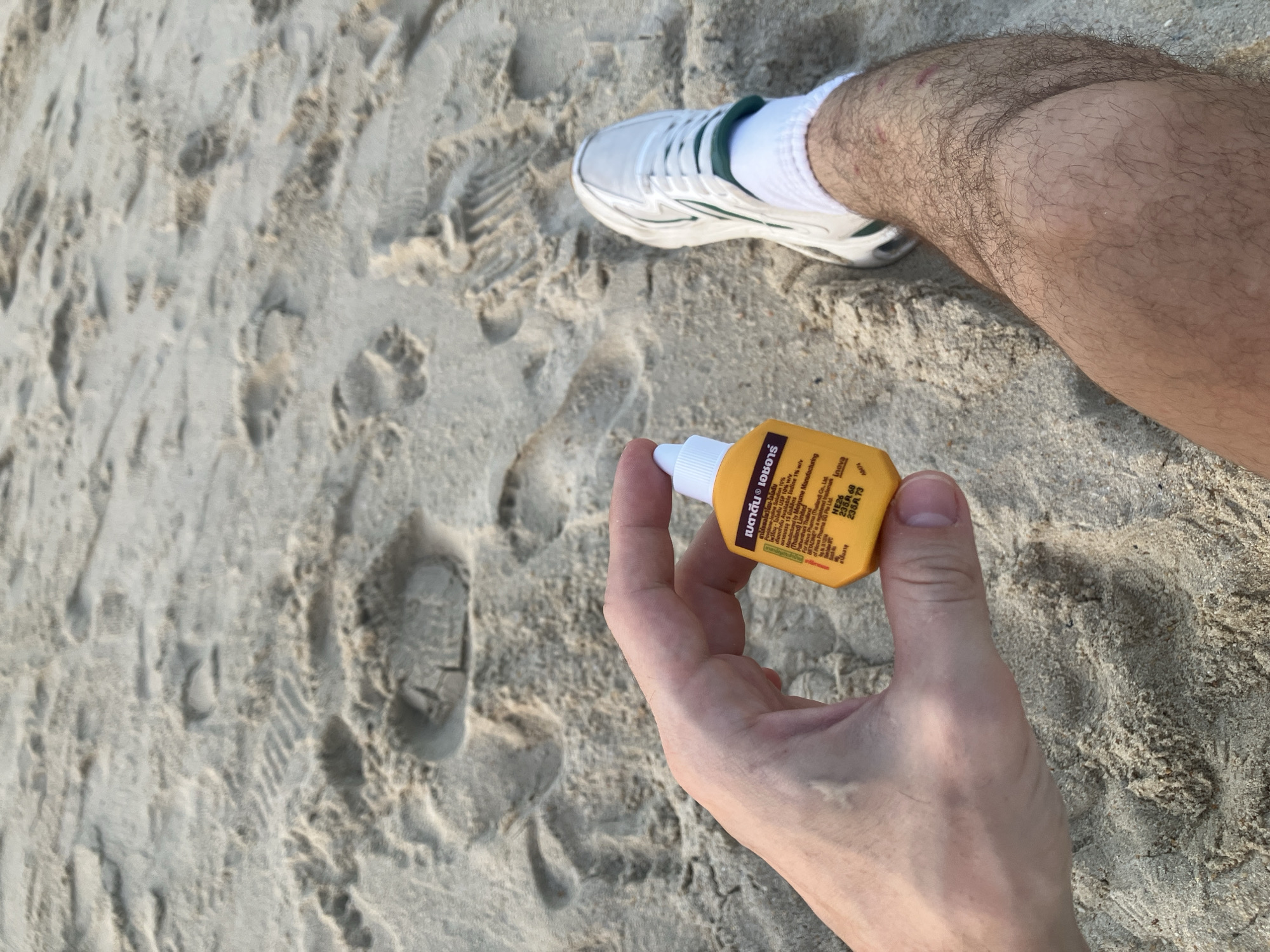 The scene depicts a close-up, low-angle view of an individual's left hand and lower right leg against a sandy backdrop, located in Baan Bang Rak, Thailand. The left hand, appearing light-skinned, firmly grips a small, rectangular, orange plastic squeeze bottle featuring a white applicator tip. Visible text on the bottle includes "Povidone Iodine 10% w/v" and Thai script, identifying it as Betadine antiseptic. The lower right leg, notably hairy, is partially visible, clad in a white athletic sock and a white athletic shoe with prominent green stripes or accents. A few small, reddish skin irritations or marks are discernible on the upper calf/lower thigh area of the right leg. The immediate environment is composed of light-colored sand, exhibiting numerous human footprints and various shoe sole imprints.