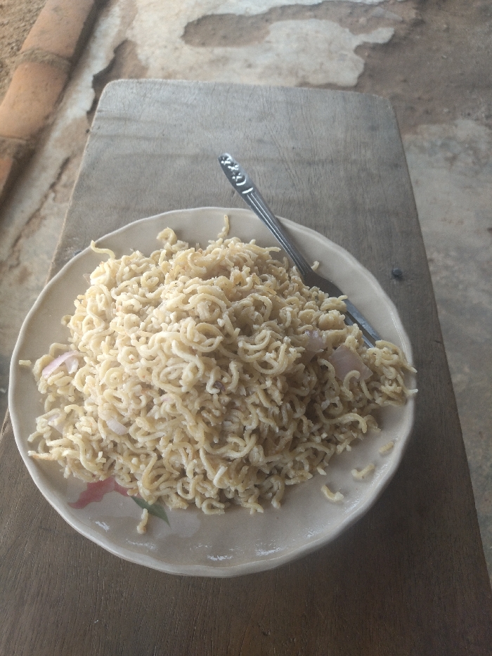 plate of noodles on a wooden table. The noodles are light brown and appear to be cooked with onions. There is a metal fork resting on the edge of the plate. The scene appears to be in a casual, outdoor setting. The coordinates provided (latitude: 7.685, longitude: 8.536) place the location in the city of Asuir, Nigeria.