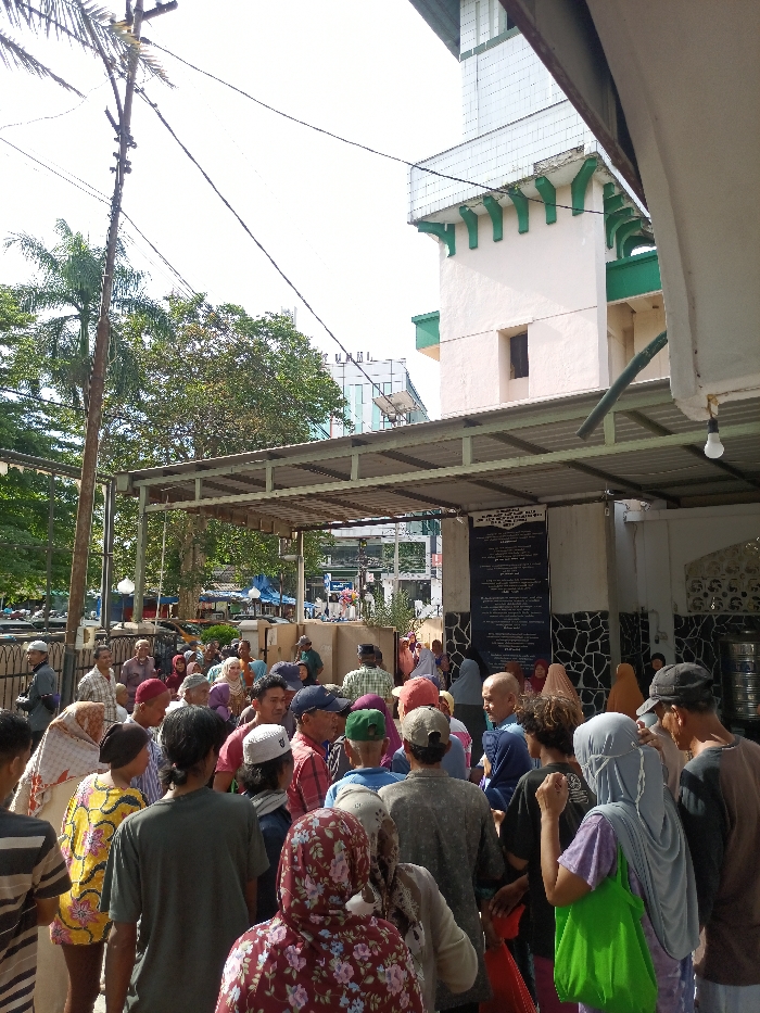 A large crowd gathers near a building with a distinctive tower featuring green architectural details. The building is partially covered by a metal awning. People are diverse in age and attire, including headscarves, caps, and casual clothing. A pole with electrical wires runs along the left side of the frame. In the background, trees and distant buildings are visible.