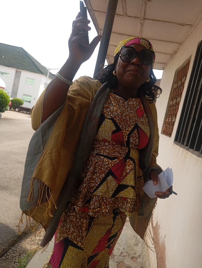 An adult female, appearing to be of Nigerian ethnicity, stands under a covered outdoor walkway during daytime