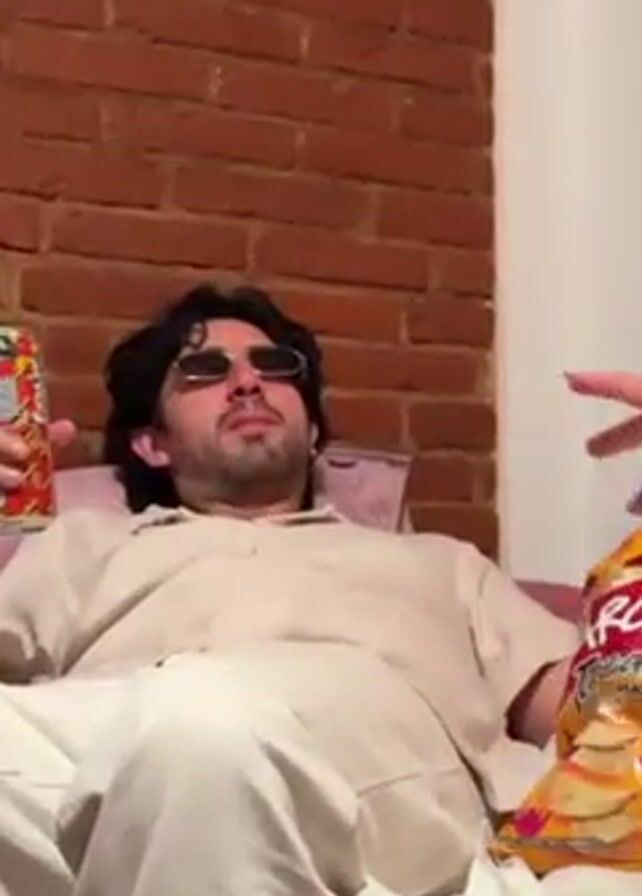 A man is sitting up in a bed, holding a beverage can in his right hand, and looking to his left. He is wearing sunglasses, a light-colored linen top, and light-colored linen pants. An arm, presumably belonging to another person, appears from the right side of the video, holding a bag of chips. Behind the man is an exposed brick wall. The bed appears to be in a residential room.