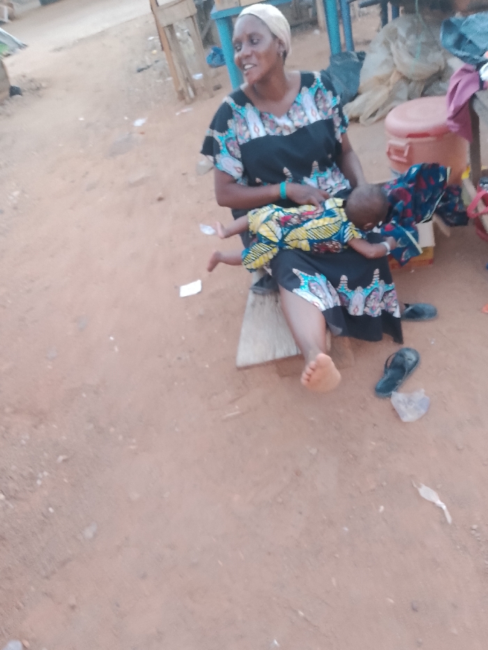 A woman is seated on a wooden stool, nursing a baby wrapped in a colorful patterned cloth. She wears a dark-colored dress with a floral pattern on the upper and lower part, a white headscarf, and a turquoise bracelet. Her right foot is bare. Dark-colored sandals lay nearby on the dirt ground. In the background, there are some furniture and a red container. The ground is reddish-brown and there is some trash.