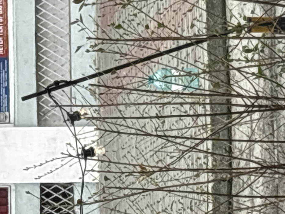 The image displays an outdoor scene at the Summer Theater in Varna, Bulgaria. The foreground is characterized by a dense arrangement of slender, bare deciduous branches, exhibiting early bud development. Behind this vegetation, a string of outdoor lights is visible, featuring at least two illuminated spherical bulbs. This light string is partially supported by a slender, dark-colored pole on the right side of the frame. Below the lights and beyond the foreground branches, a large, translucent light blue plastic bottle, partially filled with clear liquid, stands upright on a light-colored paved surface composed of rectangular tiles. The background reveals a portion of a light-colored building with windows protected by diamond-patterned security grilles. A blue and red banner or sign affixed to the building displays the Cyrillic text "ЛЕТЕН ТЕАТЪР" (Summer Theater), identifying the specific location. No individuals are present in the scene.