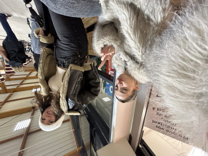 The image depicts two females posing inside a commercial building in Hœnheim, France. In the foreground, a female with dark, pulled-back hair, wearing a light grey faux fur coat and gold hoop earrings, pouts towards the camera while displaying a peace sign with her right hand. She appears to be seated on a grey upholstered surface. To her right, a second female with long dark hair, wearing a white knit beanie, a dark brown shearling-lined jacket with light shearling trim, a white crop top, and dark jeans, holds a dark handbag and looks upward and left. A third, partially obscured individual walks away in the far right background. The indoor environment features a high ceiling with exposed wooden beams and rectangular light fixtures. A light-colored pillar on the left displays a sign with partially visible French text, including the word "méritent." The background also shows a retail area with multiple dark cylindrical hanging fixtures and other patrons.