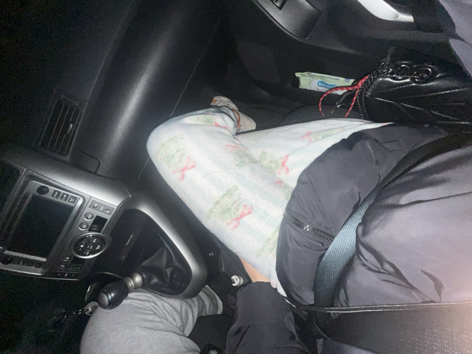Inside a car, a person wearing pajama pants with a Christmas tree pattern and a black puffer jacket is seen. They are buckled into the passenger seat. A black combat boot sits on the seat, next to the person's legs. The car's dashboard, gear stick, and console are visible on the left side of the image. A package of baby wipes is tucked away in the passenger-side storage space.