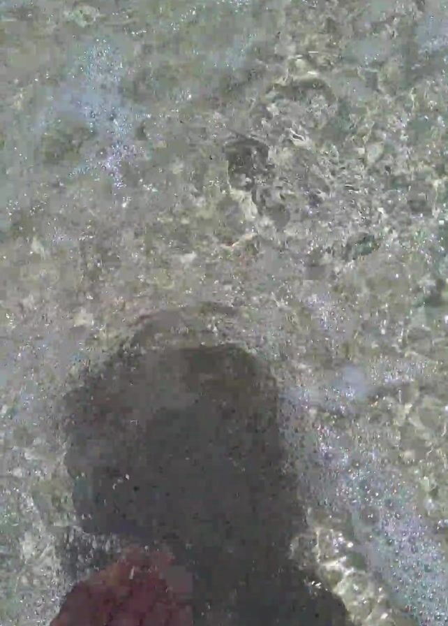 person's hand submerged in clear, shallow water. The water surface is rippled and reflects sunlight. Bubbles form around the hand as the wave recedes. The camera pans up to show a beach with clear, turquoise water meeting a sandy shore under a bright blue sky. Waves break gently on the beach.