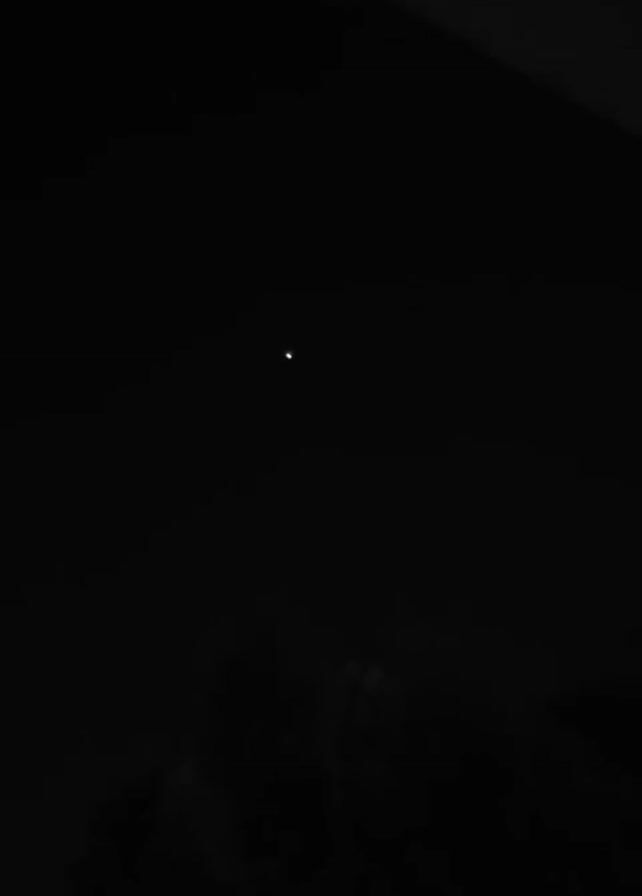 small, singular white light against a black night sky. Some vague forms, likely trees, are visible at the very bottom of the frame. The camera is static.