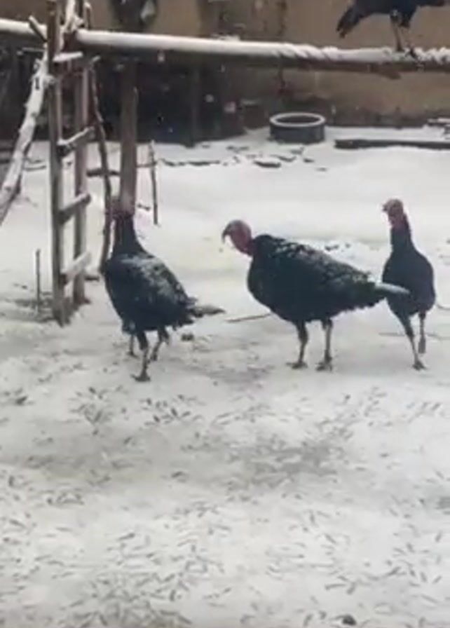 group of turkeys in a snowy outdoor environment. Six or seven turkeys are visible, walking around in the snow. Snow is actively falling. In the background, there is a fence made of wooden branches, a brick wall, and some other simple structures. The turkeys appear to be dark-colored, with the characteristic red wattle on their necks. They make distinct gobbling sounds. The scene has a rural or farm-like setting.