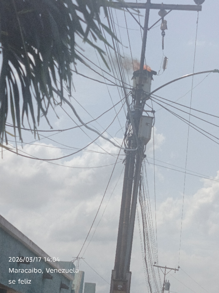 On 2026/03/17 at 14:04, a utility pole in Maracaibo, Venezuela, within the metropolitan area encompassing San Francisco, is depicted with an active fire