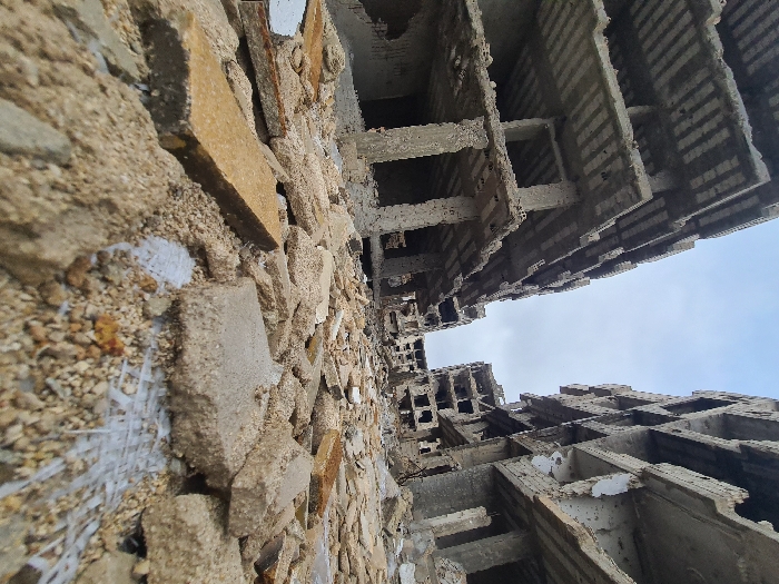 - "The image displays a severely damaged urban environment within Al-Qaboun Municipality, Syria, viewed from a low vantage point looking upwards" by FM-gCwqi1, licensed under CC BY 4.0