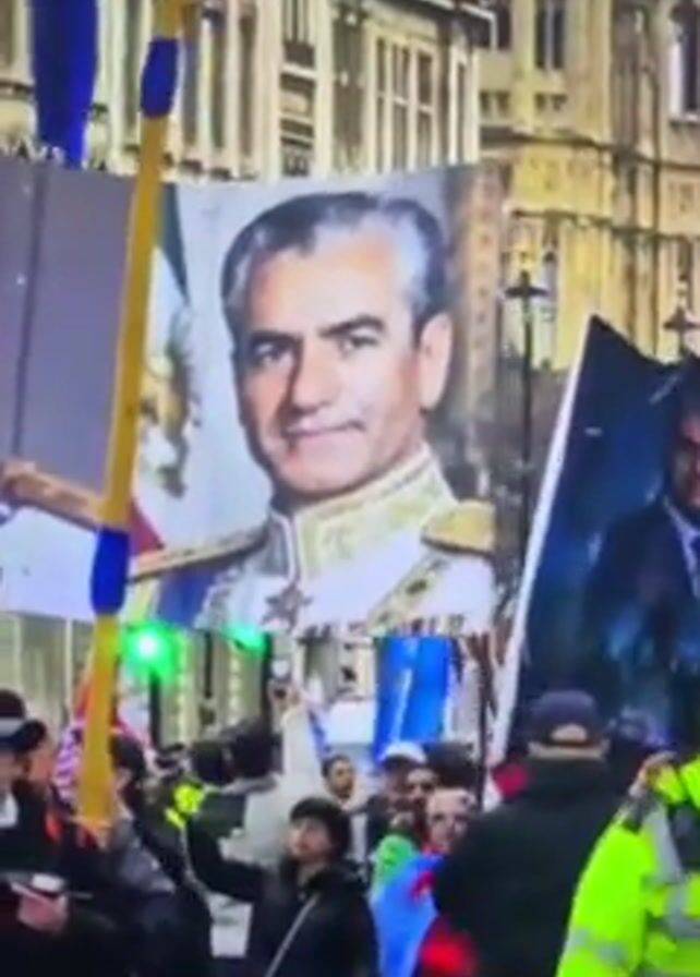 A crowd of people are protesting in a city. They are holding up signs with pictures of a man wearing military attire, the Iranian flag, the British flag, and the flag of Azerbaijan. Some of the protesters are wearing masks and winter clothing. There are also police officers present, wearing bright green vests. The background shows a large stone building. The protestors are chanting.