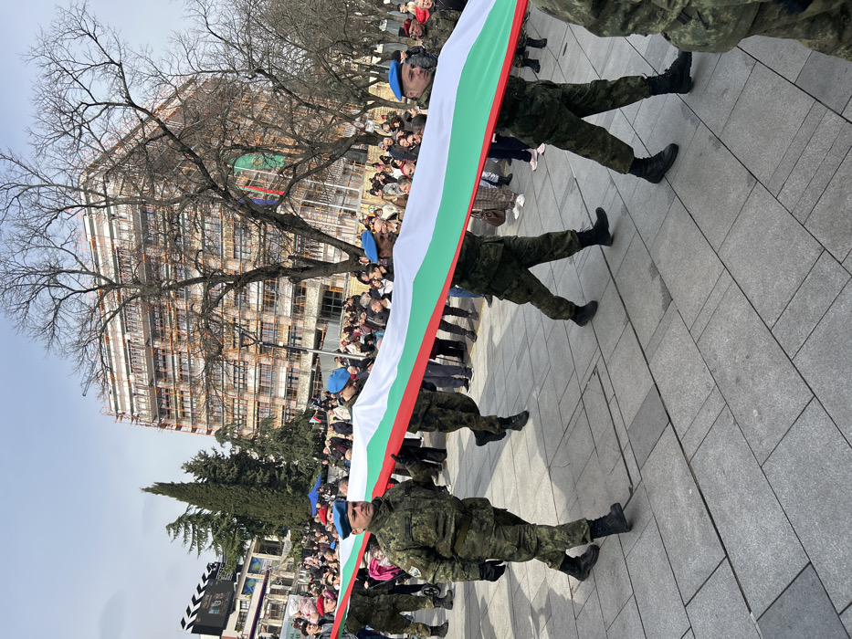 The image captures an outdoor public event in Stara Zagora, Bulgaria, under an overcast sky