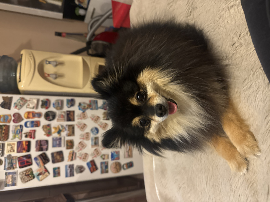 A black and tan Pomeranian-type dog, exhibiting predominantly black fur with distinct tan markings on its muzzle, above its eyes, on its chest, and front paws, lies on a light-colored, textured, possibly fluffy surface. The dog's mouth is slightly open, revealing its tongue, and it looks directly towards the viewer. In the background, to the left, a white refrigerator is extensively adorned with numerous assorted colorful souvenir magnets. To the right of the refrigerator, a light-beige standalone water cooler, topped with a large transparent water bottle and featuring two dispensing spigots, is visible. Blurred elements, including a partial red object and dark shapes, occupy the far right background. The scene is illuminated by indoor lighting. There are no identifiable visual markers within the image to confirm the specific location as Montana, Bulgaria.
