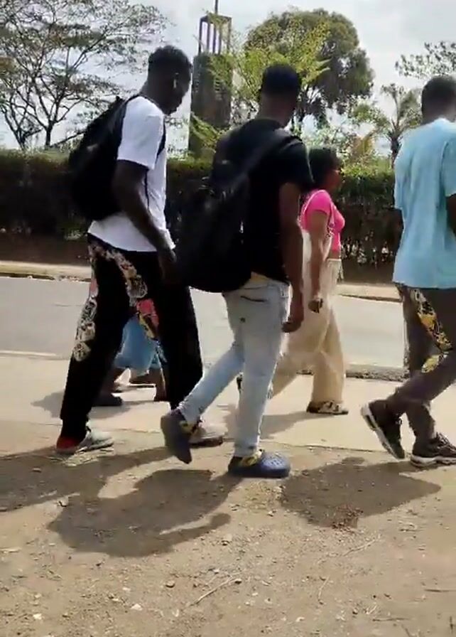 A group of seven people walks along a sidewalk on a sunny day. They appear to be walking from right to left in the frame. The first person is a man wearing a white t-shirt, black pants with graphics on them, and a black backpack. Next, a small child wearing a red t-shirt and blue bottoms walks, and after them is another small child. The fourth person is a man wearing a black t-shirt, light blue jeans, and a black bag. The fifth person is a woman wearing a pink top and beige pants, carrying a white purse. The sixth person is a man wearing a blue t-shirt and patterned grey pants. Behind them is a church with a tall tower and a cross on top. There is a tree on the right of the frame with barbed wire around its base. The road is visible on the other side of the sidewalk, and other trees and bushes are in the background.