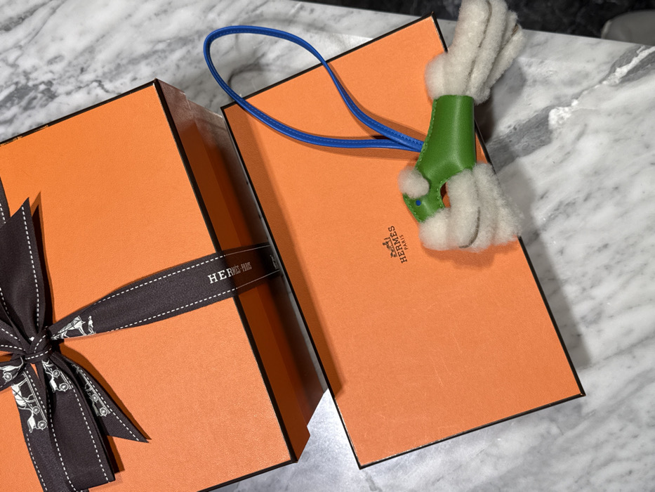 Two Hermès boxes are on a marble surface. One box is wrapped with a dark ribbon featuring a repeating carriage design. The second box is topped with a blue leather loop attached to a green leather shape with white furry tassels hanging from it, resembling a whimsical animal figure. The boxes are bright orange with black borders. The Hermès logo is visible on one box.