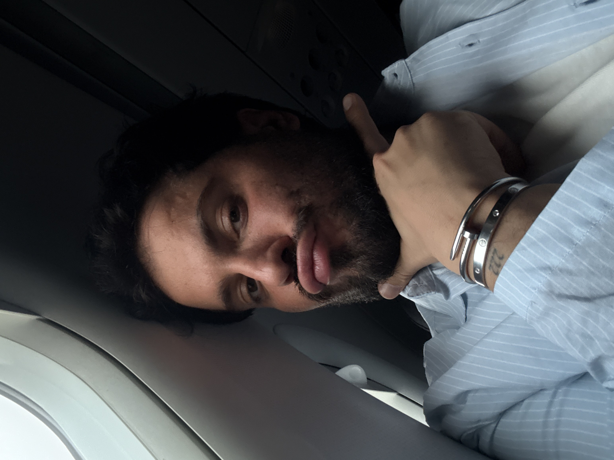 A man with dark hair and a beard is resting his head against what appears to be the wall of an airplane cabin. He is wearing a light blue, striped button-down shirt and has silver bracelets on his wrist. His right hand is raised with his index finger pointing towards the ceiling panel. The interior of the airplane cabin is visible, including the window area. The location is not discernible from this image, so providing a specific location in Peschiera Borromeo, Italy is not possible.