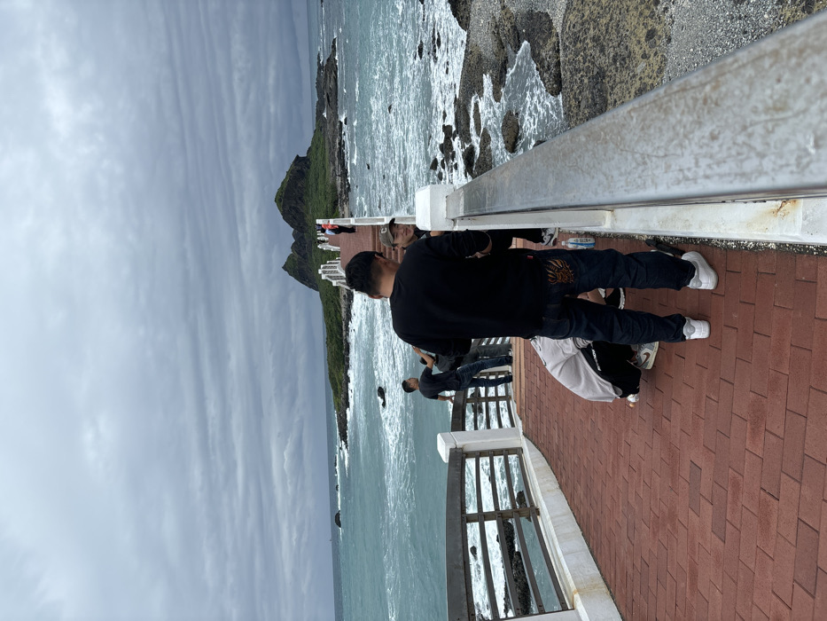 A group of people stand on a brick-paved walkway next to a metal railing, overlooking a rocky coastline with crashing waves. In the background, a green island rises from the sea under an overcast sky. One person is facing away from the camera, wearing a black shirt and jeans. Another person is crouching, partially obscured by another individual in a white shirt. Other figures are visible further down the walkway, observing the view.