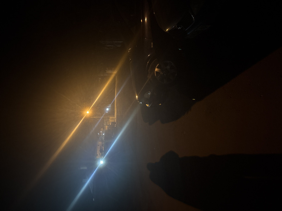The image displays an outdoor night scene in Dobrich, Bulgaria, under conditions of dense fog or mist. The foreground features a paved surface, likely a street or parking area. A dark-colored vehicle is partially visible on the right, oriented towards the left, with its front section including a silver-colored multi-spoke wheel illuminated. A second vehicle's front bumper is partially visible in the bottom right corner. Two primary light sources dominate the upper half of the image: a cool white light to the left, likely a vehicle headlight, and a warm yellow street light on a pole to the right. Both lights produce strong diagonal lens flares extending across the frame, and their illumination reveals numerous small light-reflecting particles in the air, consistent with precipitation or dense fog. An elongated human shadow, indicating the person holding the camera, is cast onto the paved surface in the lower-left quadrant of the frame. In the obscured background, faint outlines of buildings or structures are discernible through the atmospheric haze. The ground surface appears wet or reflective.