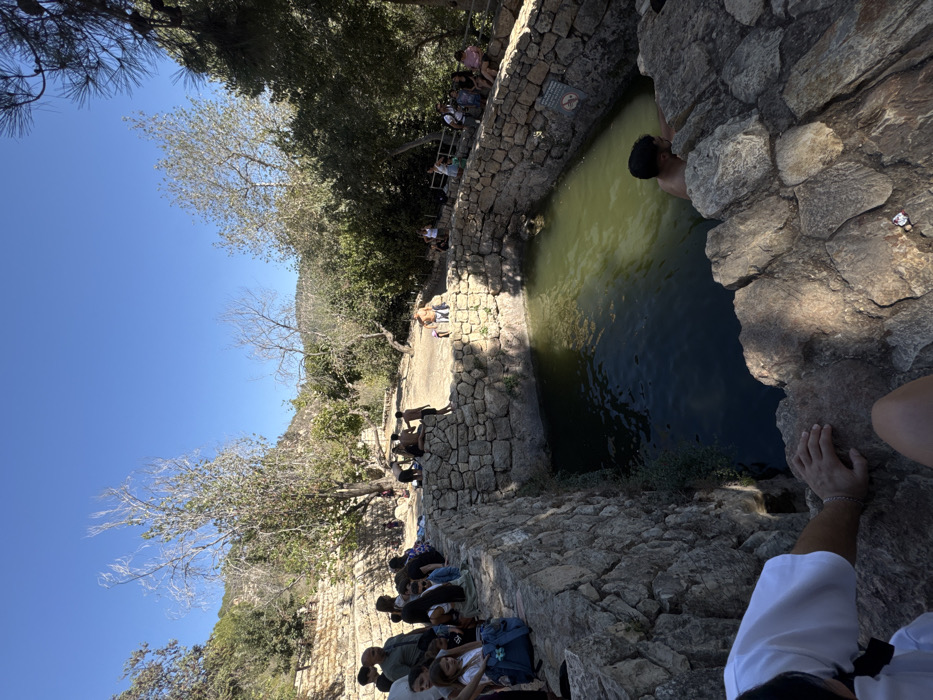 This image depicts Ein Hanya, an ancient spring and archaeological site located within the Mate Yehuda Regional Council, Israel. The scene features a stone-lined rectangular pool of water, appearing murky green to dark brown, surrounded by thick, rough-hewn stone walls. The pool is partially shaded by the walls, with sunlight illuminating the right side of the water. Numerous individuals are present: * Approximately 20-30 people, including adults and children, are gathered around the pool on the stone walls and terraced areas. * Two males are visible partially submerged in the pool's water. * On the left wall, several individuals are standing, and a blue tote bag rests on the stone. * On the right, a white sign with a red circular 'no entry' or 'prohibited' symbol is affixed to the stone wall. * More people are visible standing and sitting on higher ground and dirt paths surrounding the pool, extending into the background. The environment consists of lush green hillsides covered with trees and shrubs under a clear, bright blue sky. Some deciduous trees with sparse foliage are prominent. The terrain features natural rocky formations and man-made stone terraces. The image is captured from an elevated perspective, looking down into the pool. A person's arm, hand, and knee are visible in the immediate foreground, resting on the stone ledge, indicating the viewpoint. Small pieces of white litter are also visible on this foreground ledge.