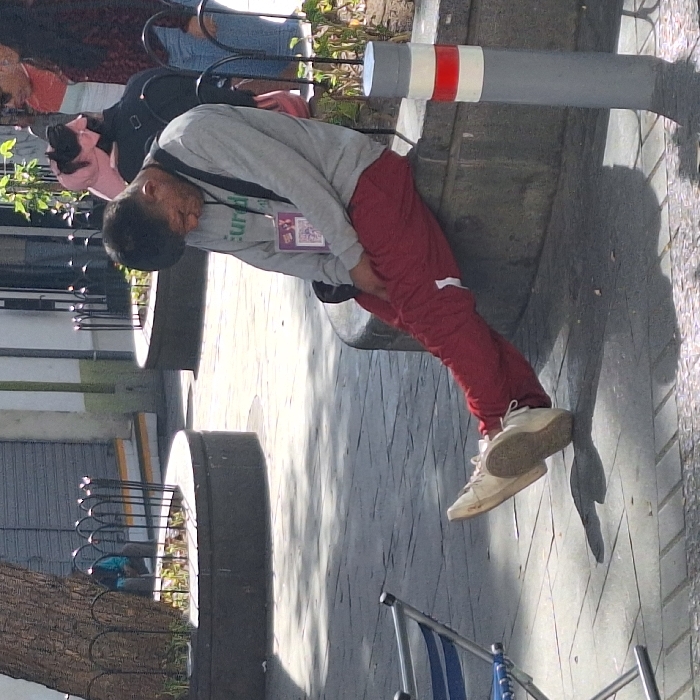 - "A man in a gray sweatshirt and red sweatpants leans against a gray concrete pillar with red and white stripes" by FM-b0Aw43, licensed under CC BY 4.0