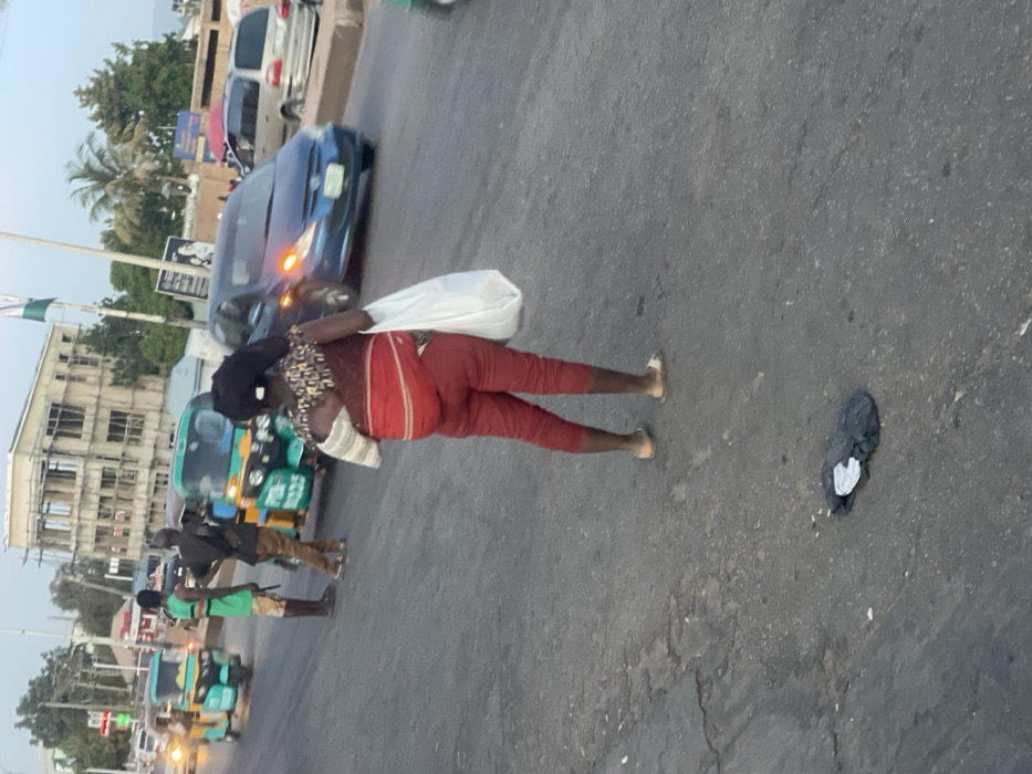 The image captures an urban street scene in Jos, Nigeria. In the foreground, a woman is depicted from behind, walking on a cracked asphalt road. She wears a dark patterned top, red capri pants, and light-colored sandals. A child or bundle is secured to her back with red fabric, further stabilized by a grey and white patterned sling across her right shoulder. She carries a white plastic bag in her left hand. Further into the scene on the left, two men are standing near two teal and yellow tricycles, commonly known as keke napep; one tricycle bears the license-like inscription "PPL 100S." One man wears a green top and holds an elongated object, while the other wears a dark top and a backpack. In the mid-ground, a blue sedan with illuminated headlights is in motion, surrounded by other vehicles. The background includes an unfinished multi-story building with exposed concrete framework on the left, alongside other structures, streetlights displaying flag banners, and sparse vegetation, including palm trees. A small, dark, discarded object rests on the road surface in the lower foreground. The sky is a light, hazy blue, suggesting late afternoon or early evening.