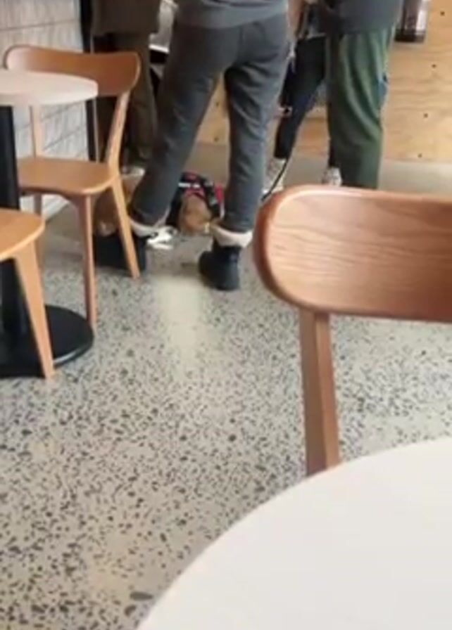 group of people standing in a public indoor space, possibly a cafe, as indicated by the wooden chairs and small tables visible. A dog, wearing a red harness labeled "SERVICE DOG", is lying down near the feet of one of the people. The floor has a speckled pattern. The person nearest the camera is wearing gray pants and black boots with fur trim. Other individuals are wearing similar casual attire, like green sweatpants and winter boots. The background includes a counter and a wall with wooden paneling. The dog remains still and quiet during the clip. In the audio, there is a brief alarm sound.