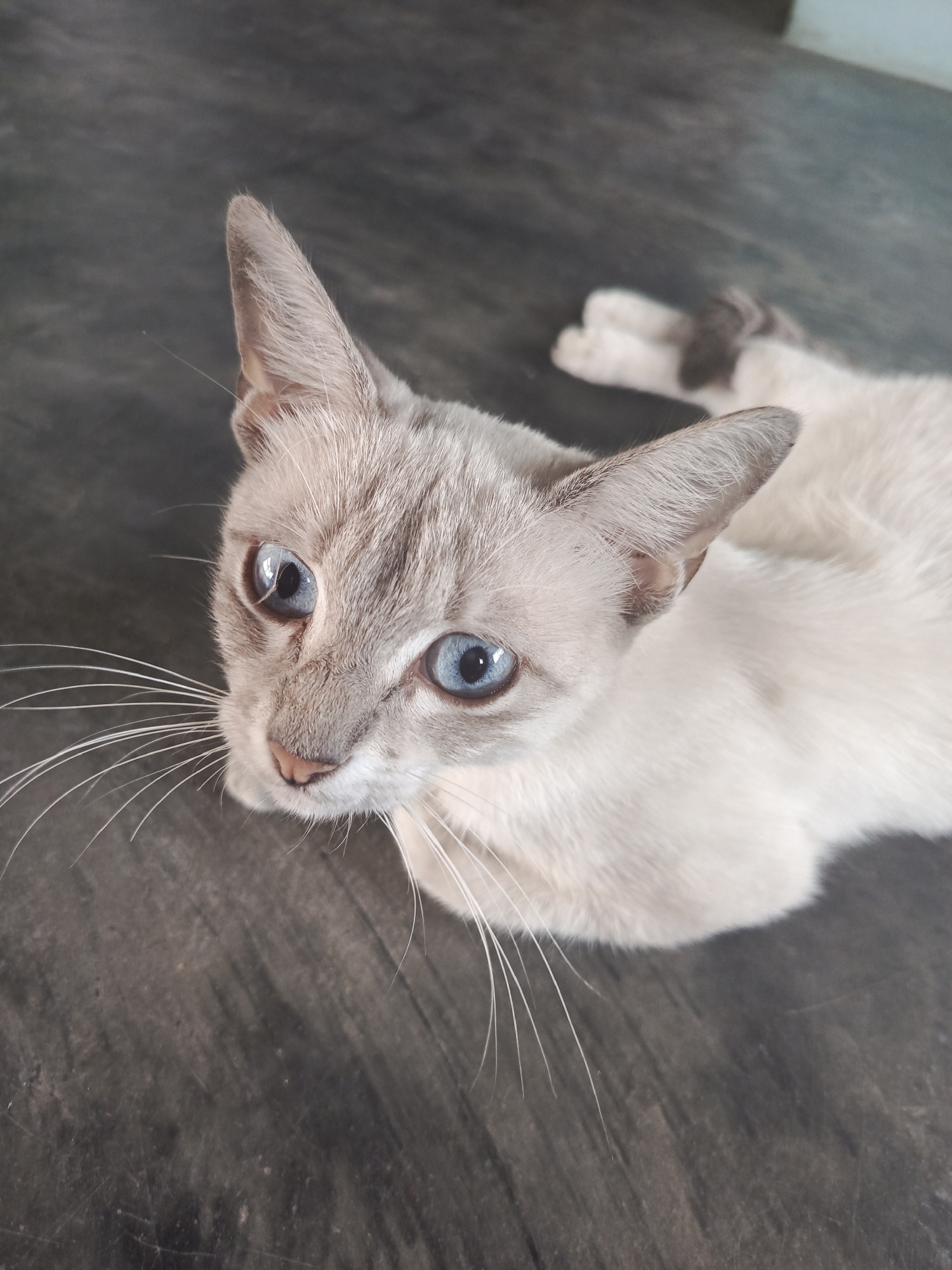 A close-up, high-angle shot shows a light-colored cat with striking blue eyes lying on a dark, presumably wooden, surface