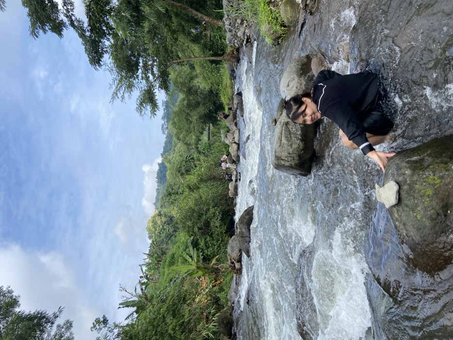 A woman in dark clothing stands in a fast-flowing river, gripping a mossy rock. White water rushes around her. The river is bordered by lush green vegetation, including trees and banana plants. In the background, other people can be seen near a bridge. The sky is partly cloudy, with shades of blue and white peeking through. The image is taken at an angle, with the woman and river dominating the right side.