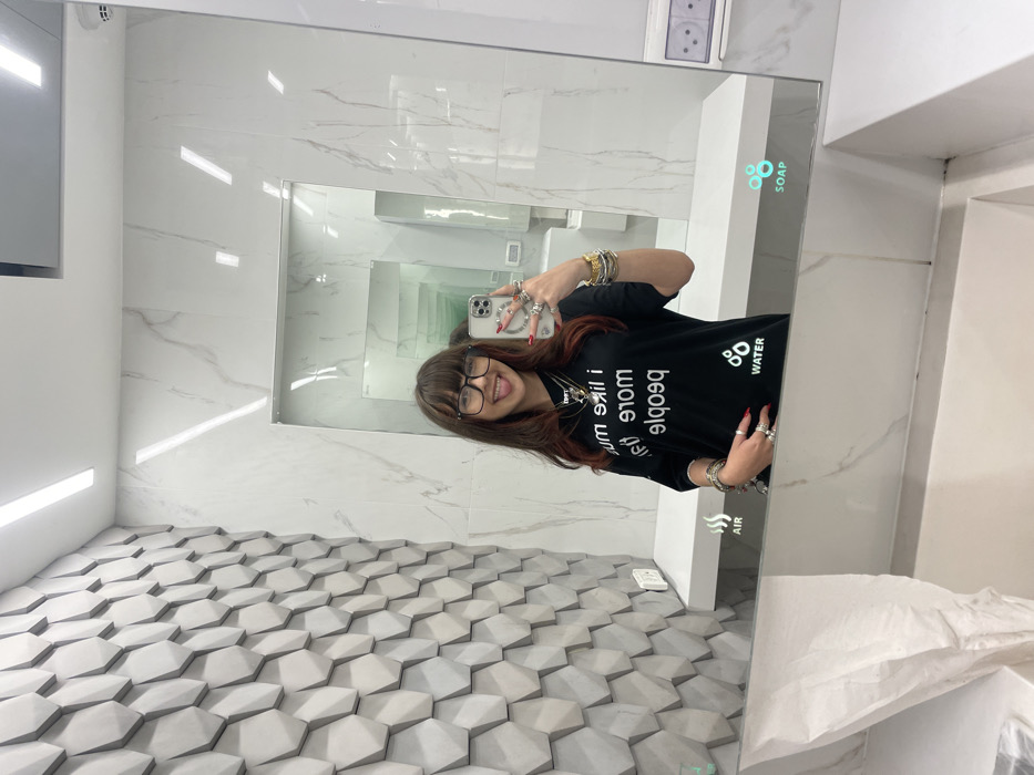 The image depicts a female individual taking a mirror selfie inside what appears to be a modern public restroom at an airport in Israel. The individual, framed from the waist up, has shoulder-length dark hair with lighter, possibly auburn, ends and bangs, and wears black-framed glasses. She is shown sticking her tongue out. Her attire consists of a black t-shirt with white text, reversed in the mirror, reading "I like more people." She wears multiple rings on both hands and numerous metallic bracelets on both wrists. Her left hand holds a light-colored smartphone, equipped with multiple camera lenses, pointed towards the mirror for the reflection. The immediate environment features a large, rectangular mirror as the central element. Below the mirror is a white, flat counter, beneath which a white sink basin is partially visible. Integrated into the bottom edge of the mirror are illuminated icons for "AIR," "WATER," and "SOAP." The wall to the left of the individual is covered with light grey, three-dimensional hexagonal geometric panels. The wall to the right and reflected walls behind the individual are tiled with white marble-patterned material. The ceiling is white and features recessed linear LED lighting fixtures. A white double electrical outlet with two plugs is visible on the far right wall. A white paper towel dispenser is partially visible on the lower left, beneath the counter. Within the main mirror, further reflections of the room suggest additional mirrors, creating a perception of depth.