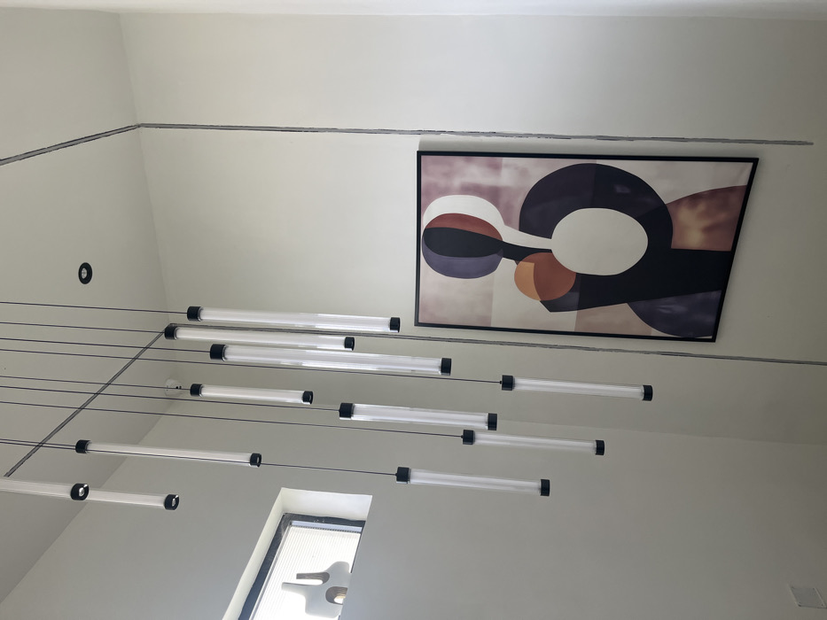 This image captures an interior view within a building located in Gwarinpa, Nigeria. The scene features a modern chandelier composed of approximately sixteen clear cylindrical tubes with black end caps, suspended at various heights by thin black cords from a white ceiling. A single black recessed light fixture is visible in the ceiling to the upper right of the chandelier. On the off-white wall to the right, a large, vertically oriented framed abstract artwork is mounted. The artwork depicts interconnected geometric and organic shapes in a palette of black, white, purple, and reddish-brown tones. In the upper left quadrant, a horizontal window with a white frame and interior horizontal blinds is visible. A white, abstractly shaped decorative object rests on the window's sill. A faint vertical seam or trim detail extends along the right wall. No individuals are present, and no actions or interactions are depicted.
