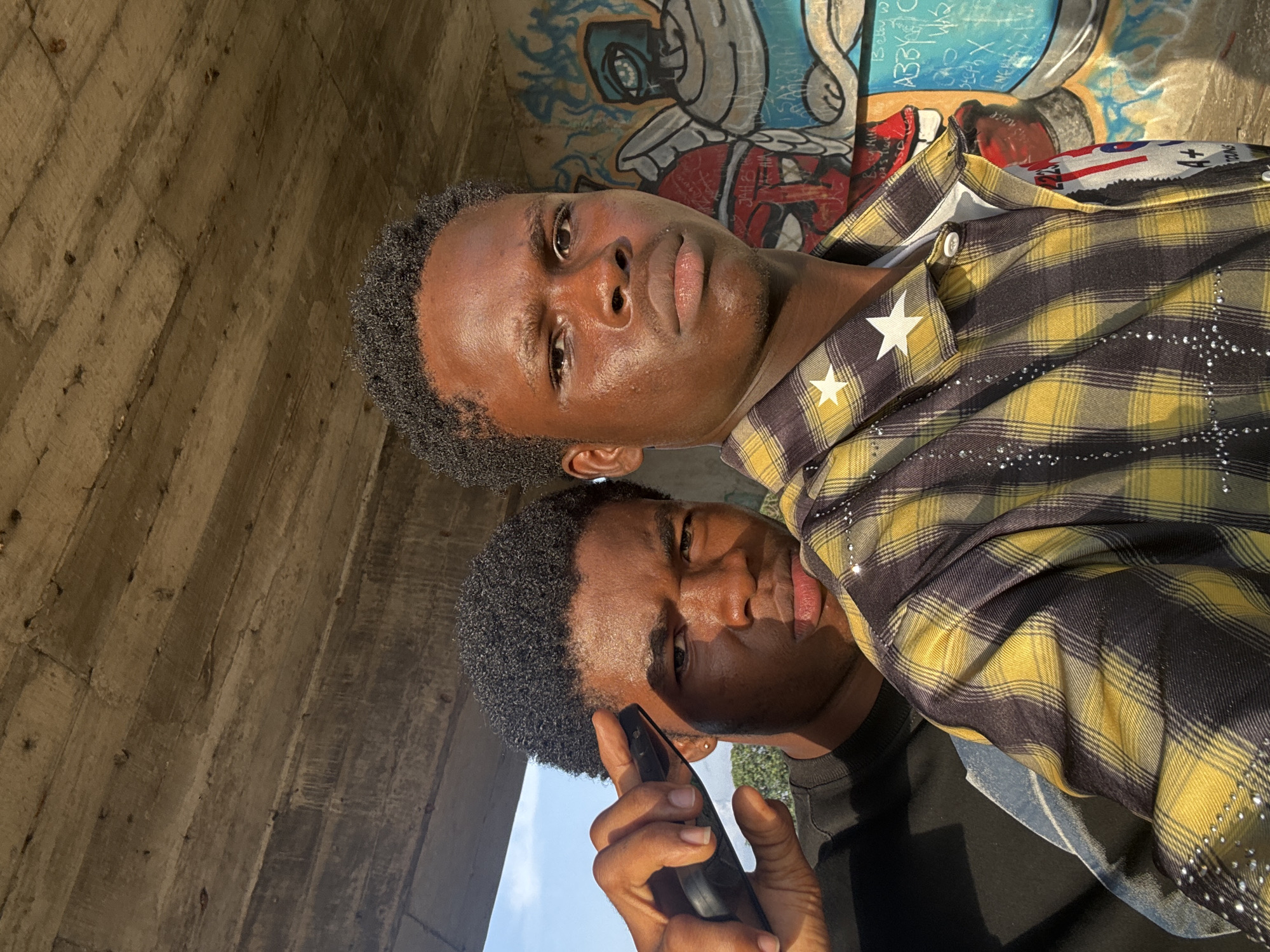 Two young Black men pose closely together, likely for a selfie, in an outdoor location near what appears to be an elevated concrete structure. The man in the foreground holds a dark-colored cell phone up to his ear. The man behind him is wearing a yellow and black plaid shirt adorned with star embellishments on the collar and small sparkles throughout. Graffiti can be seen on the wall behind them. The location is believed to be in Ihiagwa, Nigeria.