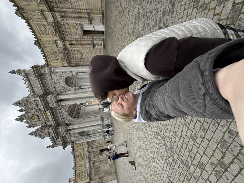The image depicts an outdoor scene in front of the ornate main entrance gate of Dolmabahçe Palace in Beşiktaş, Istanbul, Turkey. In the immediate foreground, a selfie captures two individuals. A person with blonde hair, wearing a grey quilted jacket over a light-colored hoodie, smiles with eyes closed as a second individual, wearing a dark brown hoodie and a light beige quilted vest, kisses their right cheek. In the mid-ground, to the left of the foreground subjects, a brown tabby cat sits on the paved surface. Several other individuals are visible further back, walking or standing, with one pair appearing to be engaged in photography. The dominant background element is the grand, Baroque-style stone entrance gate of Dolmabahçe Palace, featuring multiple arches, columns, and extensive intricate carvings. The ground is paved with irregular light-colored cobblestones, and the sky is overcast.