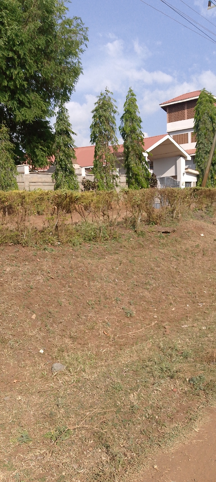 The image displays an exterior scene in Bondo, Kenya, under a blue sky with scattered white clouds. The foreground consists of dry, reddish-brown soil mixed with sparse green and desiccated brown grass, along with minor detritus. A trimmed, low hedge with predominantly green and some browned foliage extends horizontally across the middle ground. Behind this hedge, a property boundary wall constructed of grey and white concrete is visible. A series of tall, slender evergreen trees, characterized by their conical or columnar shape, are situated behind or alongside this wall. Further back, structures with reddish-brown tiled roofs are present. One prominent building features a multi-story section with an upper level exhibiting patterned lattice-work or screening, topped by a matching tiled roof. An entrance portal, consisting of a light-colored arched canopy and a dark metal gate, is visible on the right, providing access to the property. A large, dense green tree is partially visible on the far left of the frame. Thin utility lines are observable traversing the upper right portion of the sky. No individuals or discernible activities are depicted in the scene.