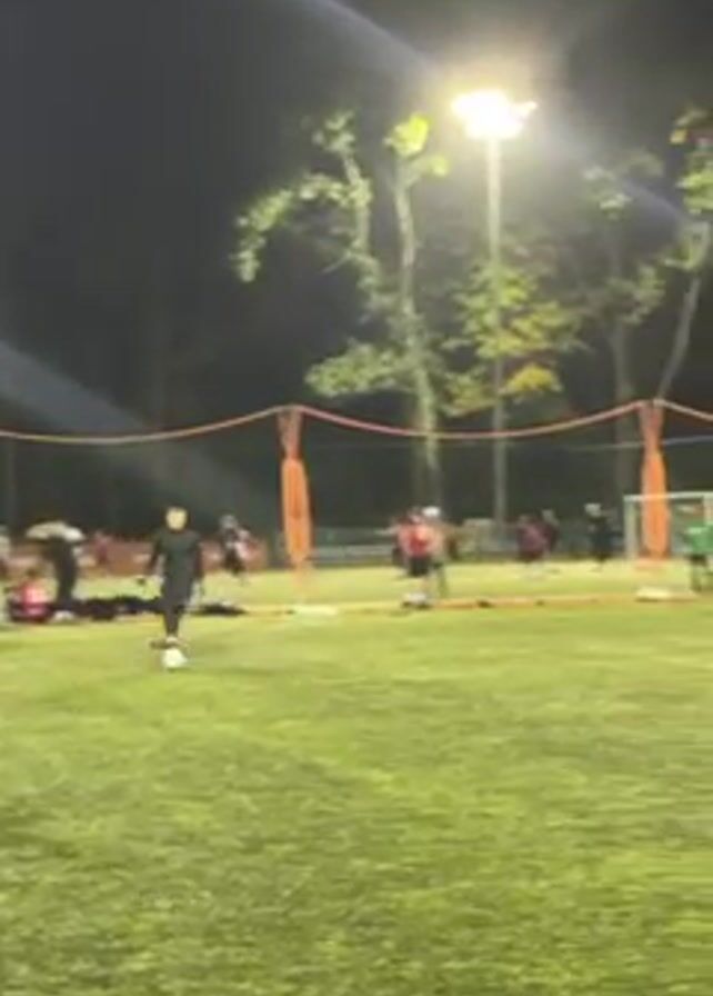 person playing soccer on a green field at night. The field is lit by stadium lights. Other players are visible in the background, and there are tents set up along the side of the field. The person in the foreground dribbles the ball, kicks it, and then follows the ball as it moves down the field.