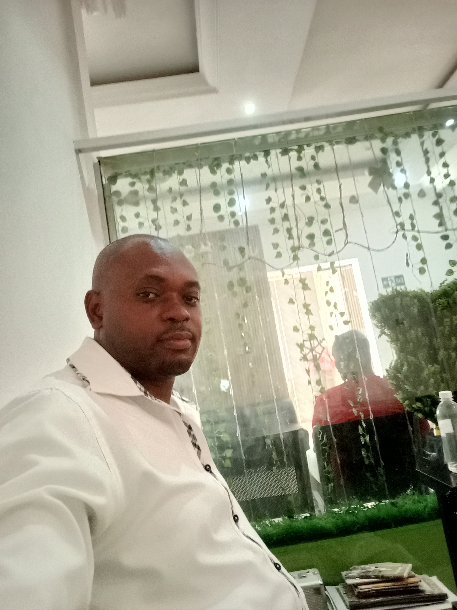 A medium shot captures a Black man with a shaved head wearing a white, collared shirt. He is looking directly at the camera. Behind him, there's a glass partition adorned with hanging ivy. Through the partition, a person in a red and black garment is visible. In the lower right corner, there's a black table with a water bottle and some stacks of papers or magazines. Based on information in the metadata, the photo was taken in Gwarinpa, Nigeria. The environment suggests an indoor setting.