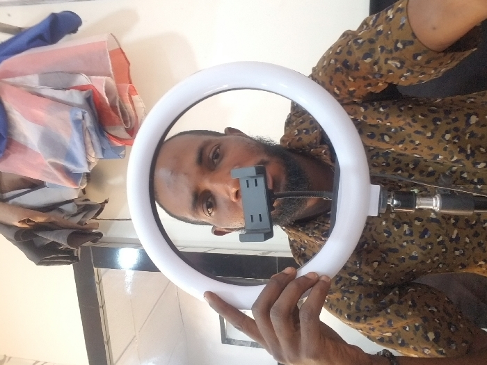 An adult male subject is depicted in an indoor setting, identified as Adankolo, Nigeria. He is positioned centrally, looking directly into the camera with a neutral expression. A large, white circular LED ring light, mounted on a black tripod stand, occupies the foreground, framing his upper torso and face. A black smartphone holder is attached to the center of the ring light. The man, with dark skin, dark hair, and a beard, is wearing a collared shirt with a brown and black leopard print pattern. His left hand is positioned on the upper left portion of the ring light. In the background, light-colored walls are visible, along with dark vertical structural elements. Multiple pieces of fabric, including blue, red, and white patterns, are hanging in the upper background.